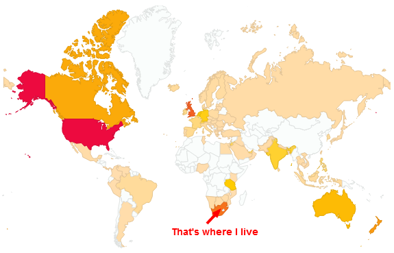 Barring today and tomorrow, I’ve had 6 262 views this year, averaging seventeen per day. Given that I only started posting with any regularity around May, I reckon this is pretty good (and if I only count from May onwards that average changes to twenty-five). I’ve had visitors from 88 different countries, including the only country on Earth with a non-rectangular flag (Nepal), and with the top ten countries in terms of visitors (in descending order) being the USA, the UK, my own South Africa, New Zealand, Canada, Australia, Tanzania (I’d appreciate it if the reader from Tanzania could leave a comment – I’d like to know who you are), the Netherlands, Germany and India.